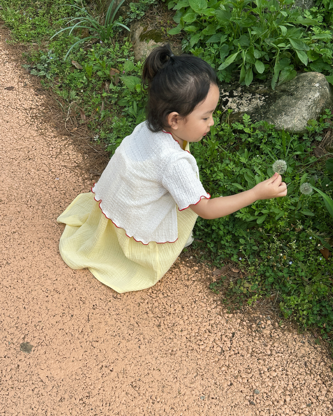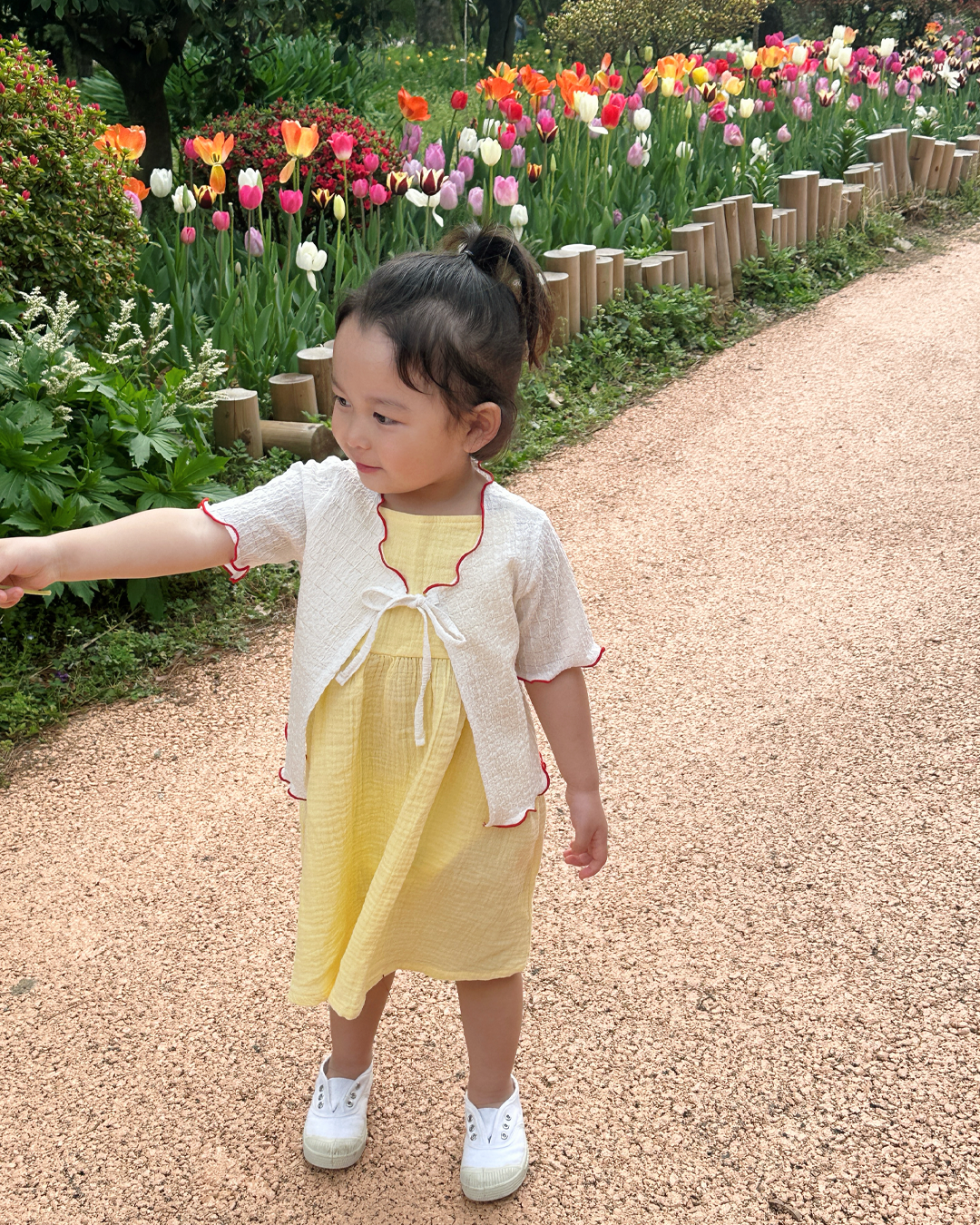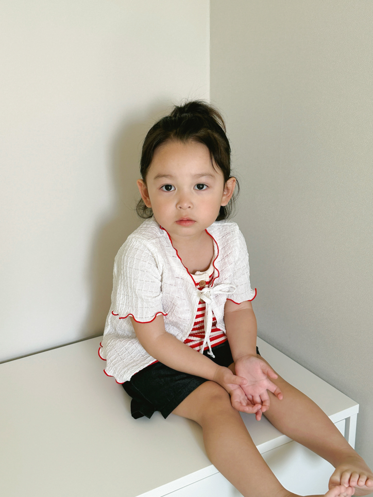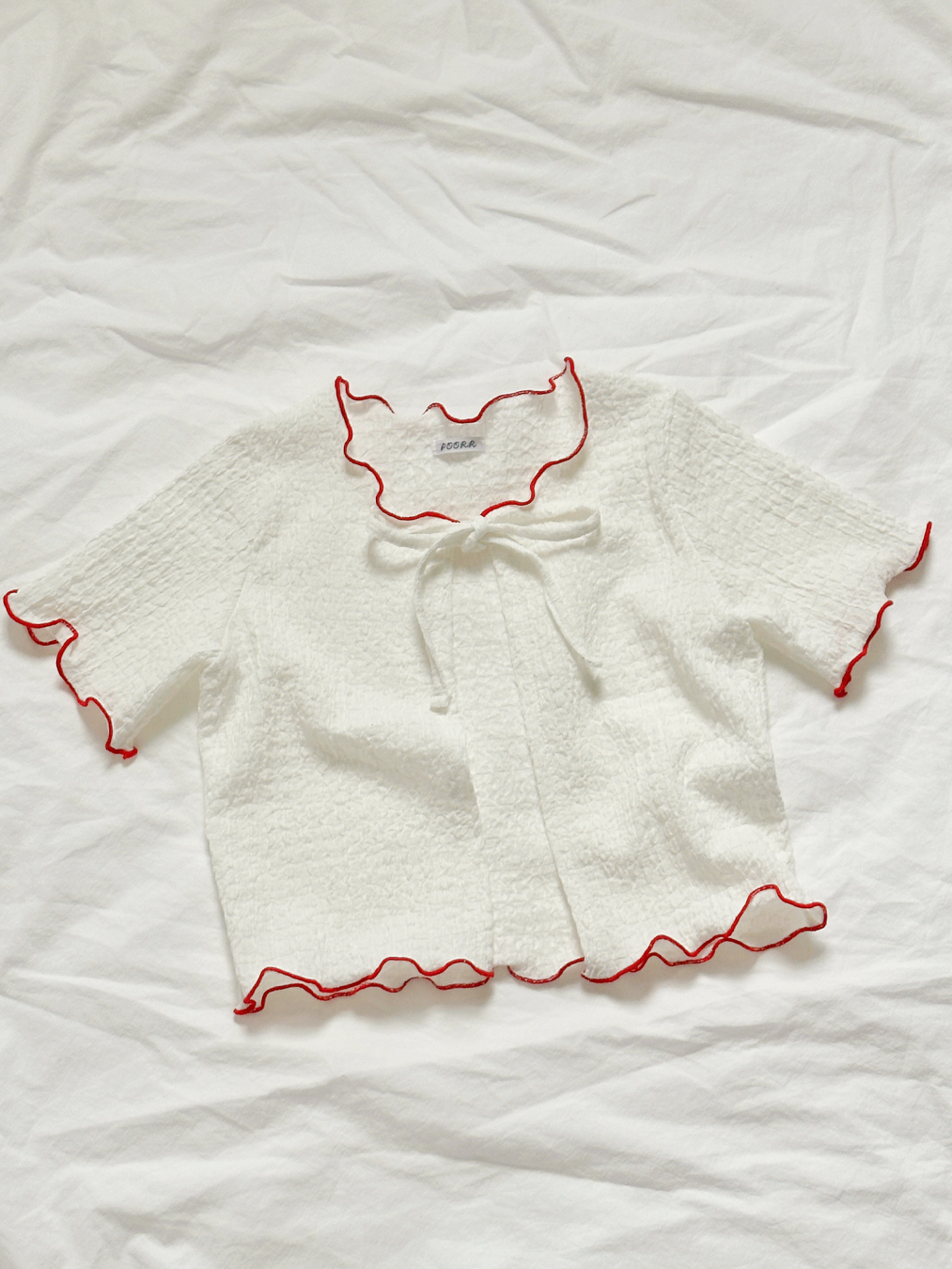 - 네크라인, 소매, 밑단에 레드 포인트와 가슴 리본매듭으로 사랑스러운 무드로 연출가능합니다.