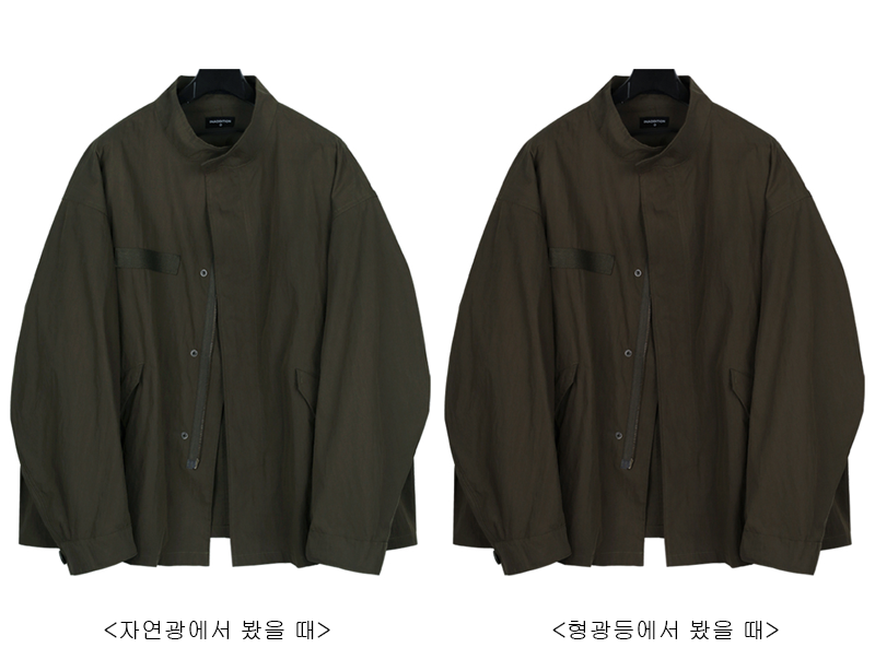 원단이 오묘한 색이라 자연광에서 볼 때와 형광등에서 볼 때 색상 차이가 조금 있습니다. 자연광에선 초록색이 조금 더 많이 보이고 형광등에선 붉은끼가 조금 더 많이 보입니다.