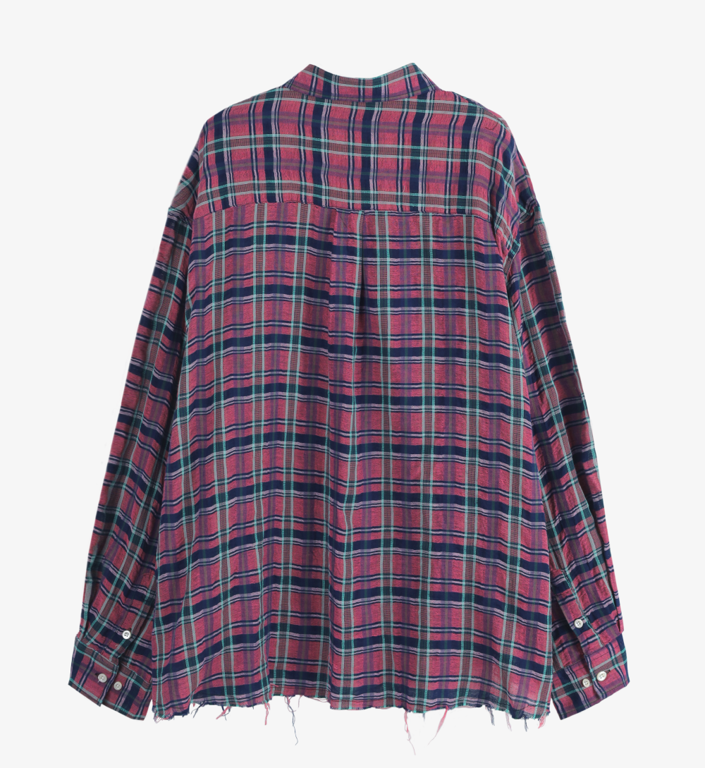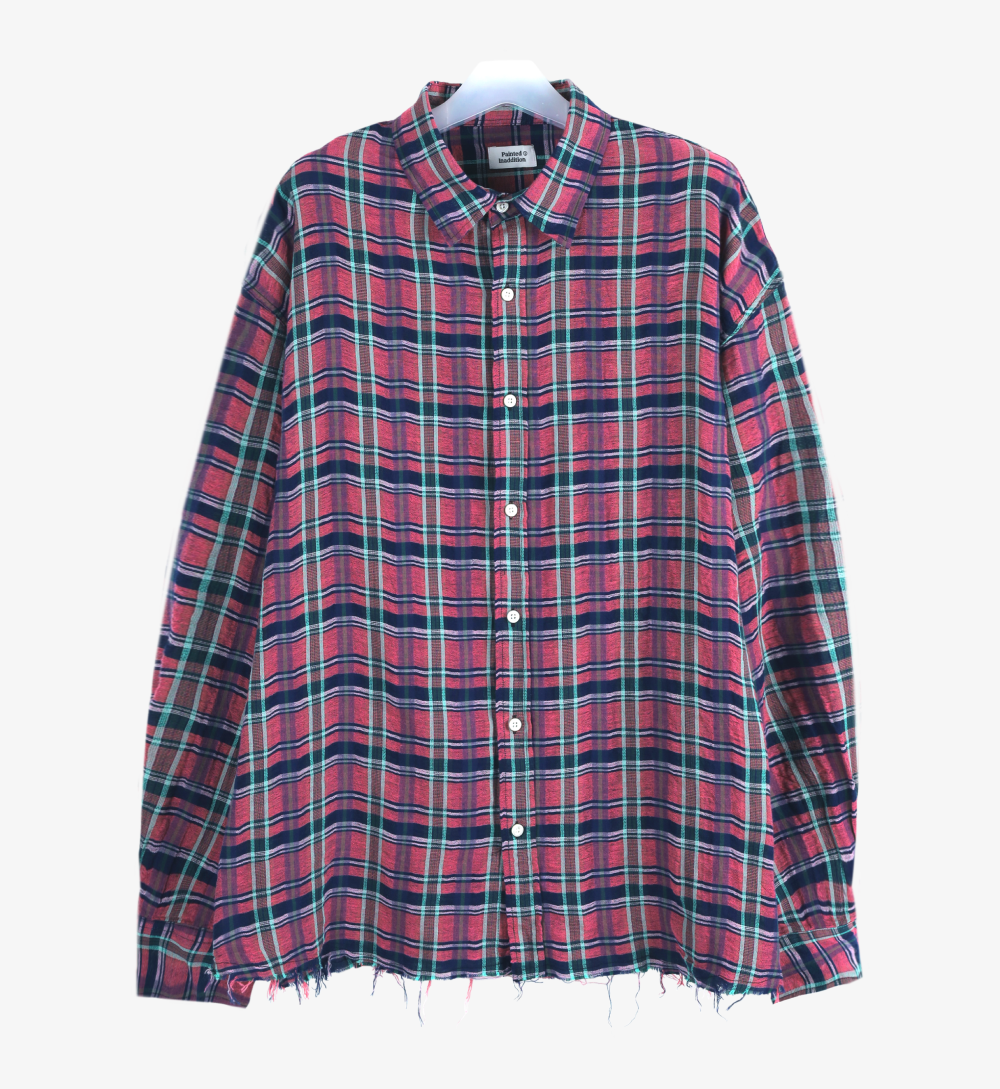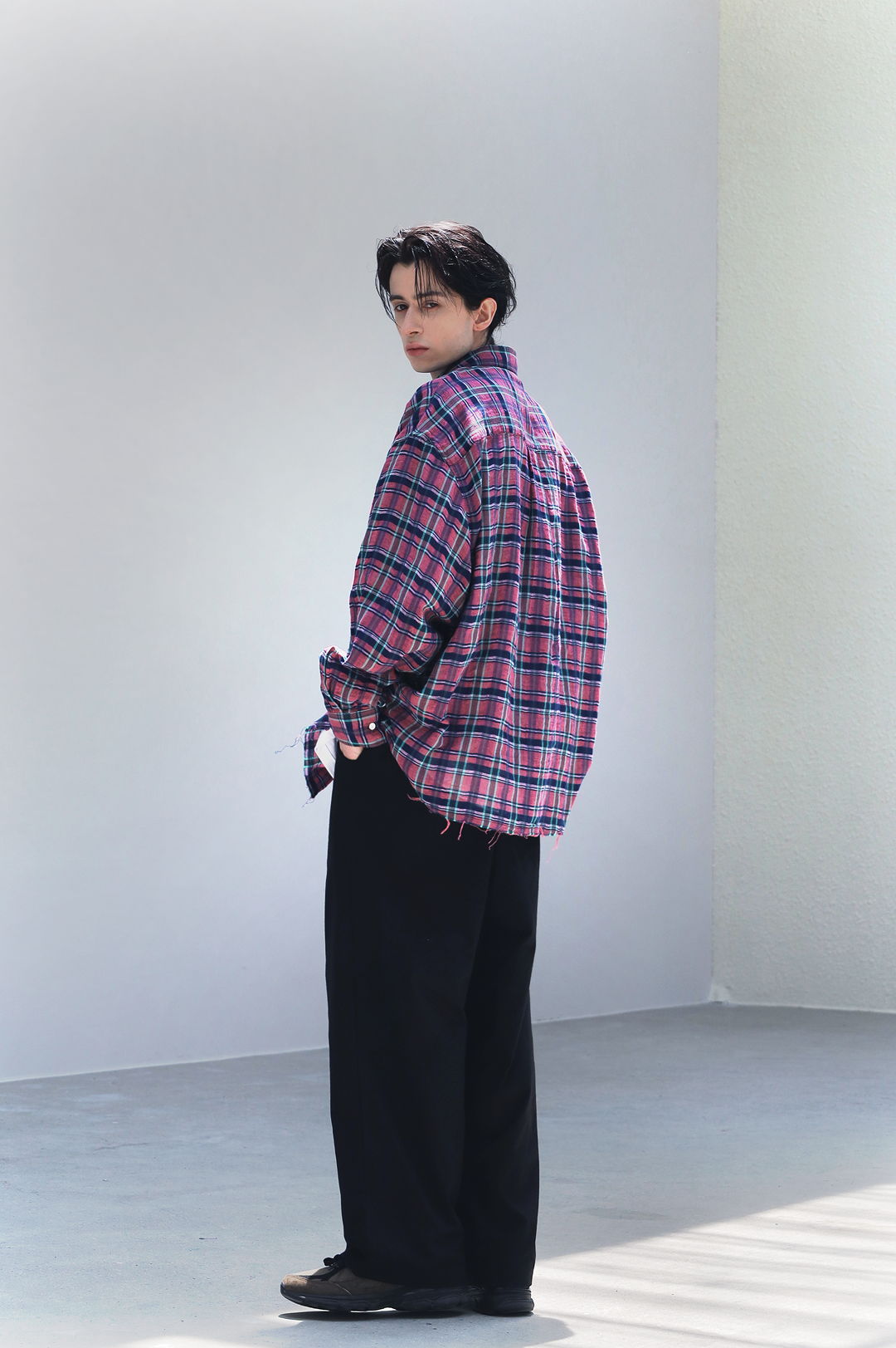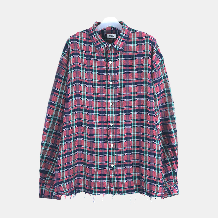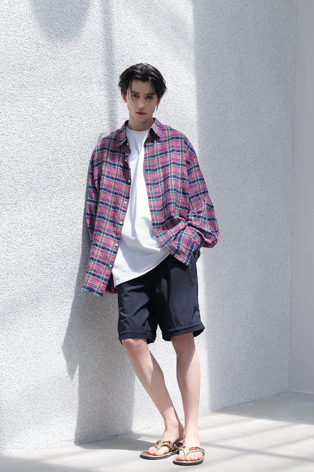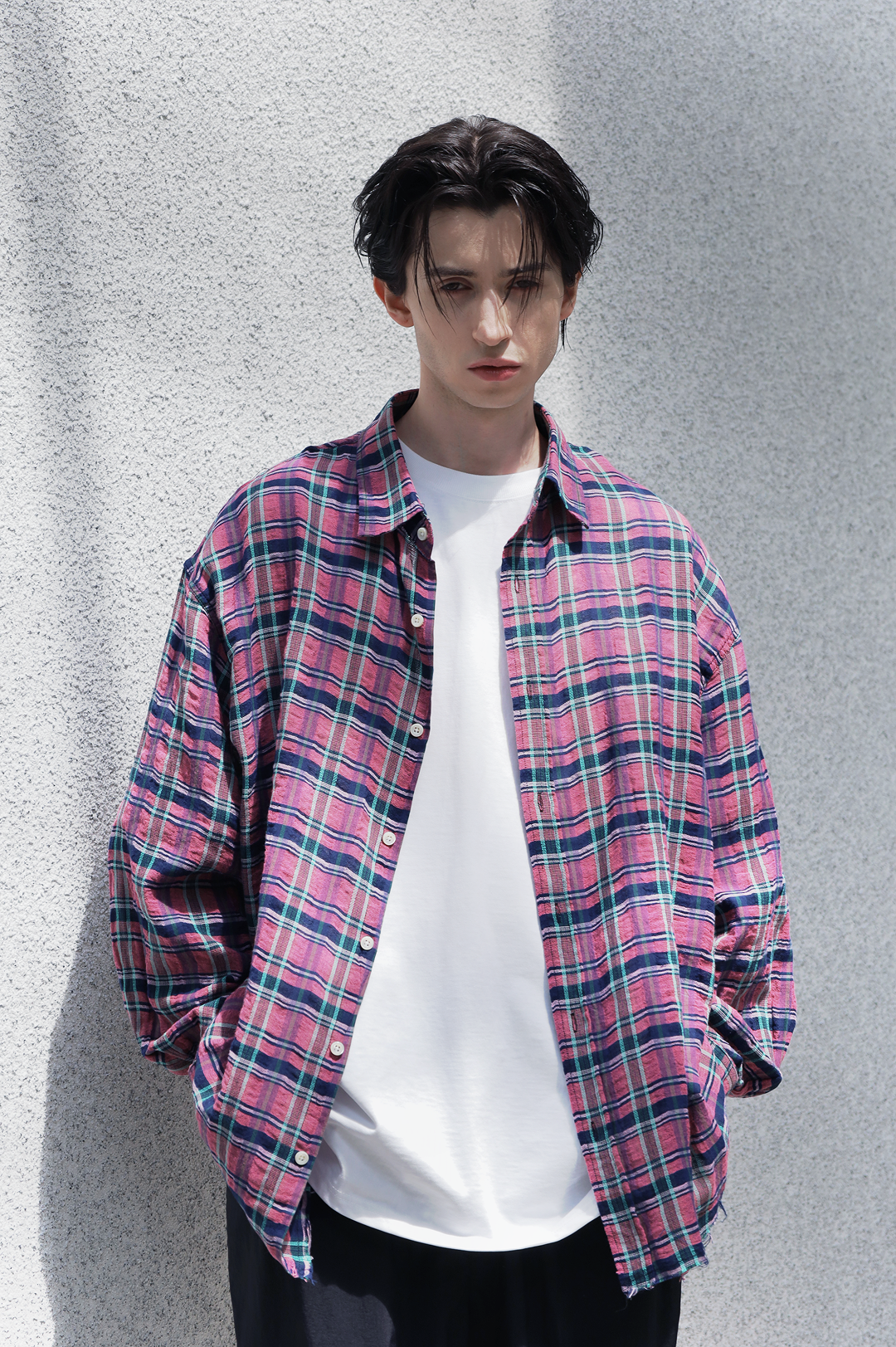 여름에도 걸칠 수 있게 짜임새가 촘촘하지 않아서 통기성이 좋은 면 100% 소재로 제작된 오버핏 체크 셔츠입니다. 핑크와 네이비 체크 패턴의 원단으로 제작 했습니다. 기본처럼 보일 수 있지만 밑단은 데끼처리를 해서 자연스럽게 원단의 올이 빠져보이도록 디자인했습니다. 니혼바리 봉제방식이며 인타방식에 비해 실이 쉽게 풀리지 않고 마감이 깔끔하다는 장점이 있는 고급 봉제 입니다. 편안한 착용감과 스타일리시한 실루엣을 동시에 제공하며, 3mm 트로카스 자개단추를 사용했습니다.