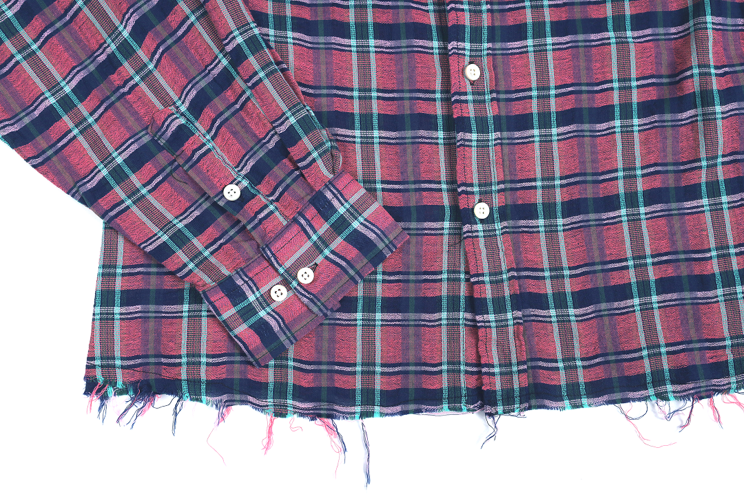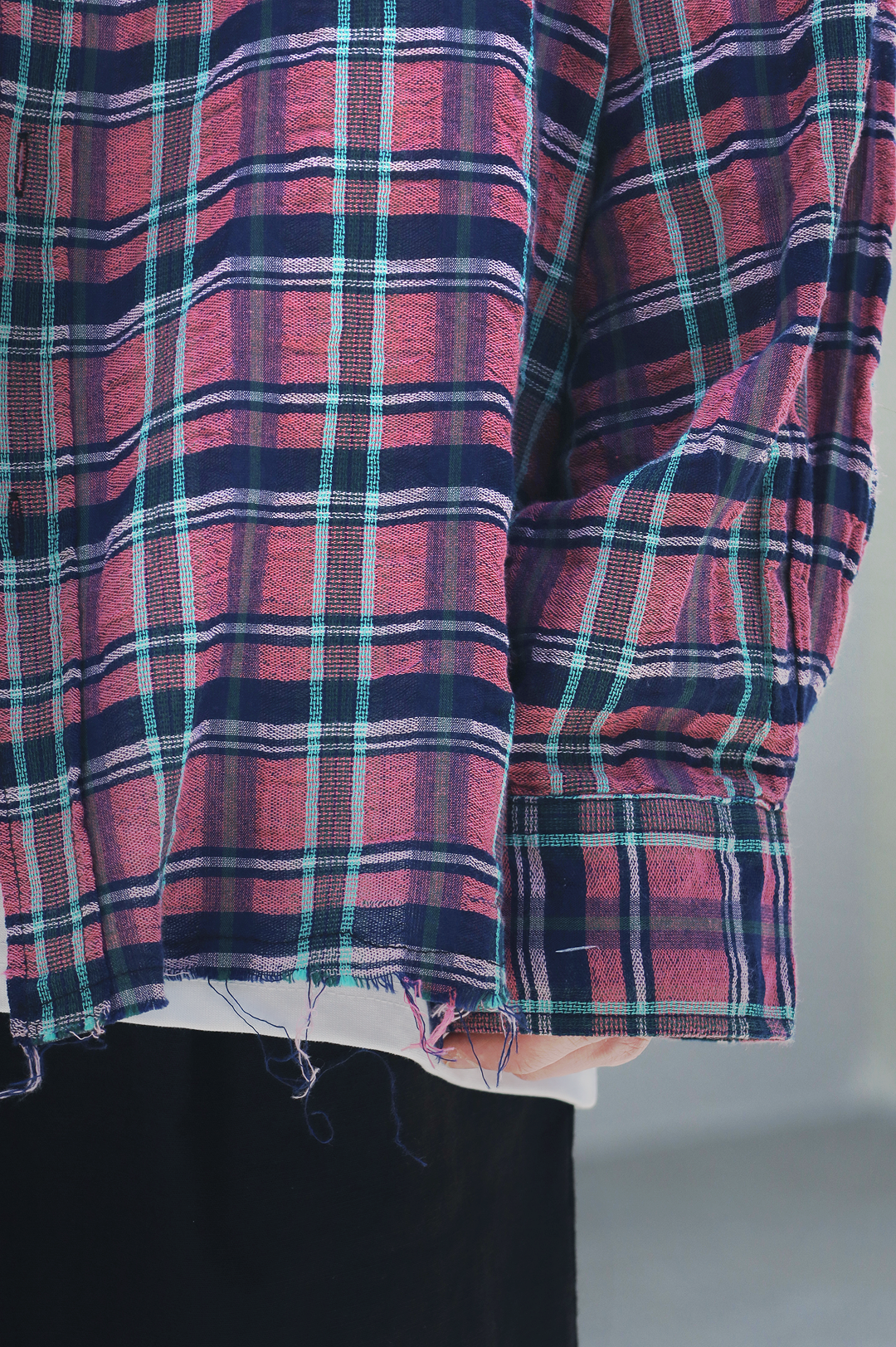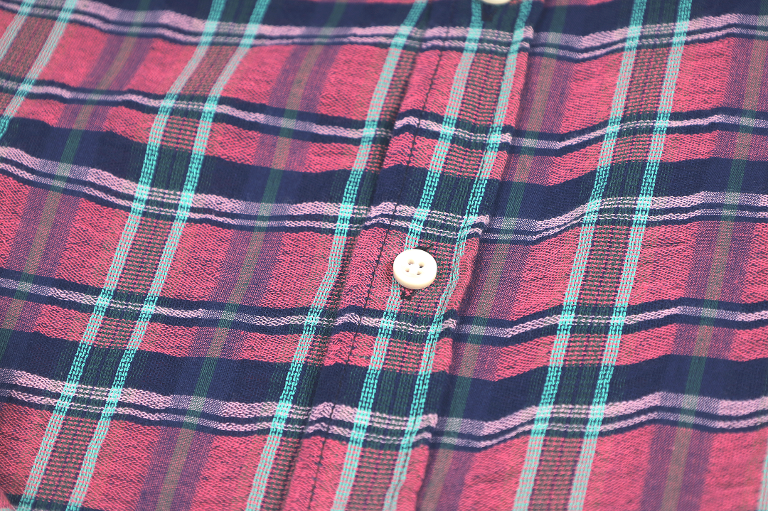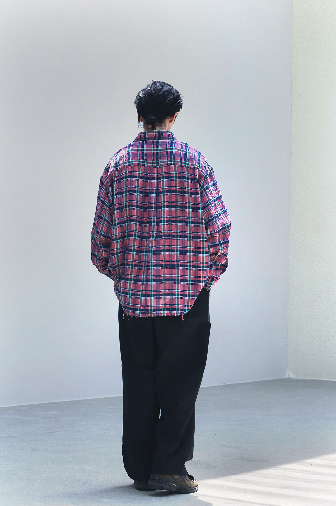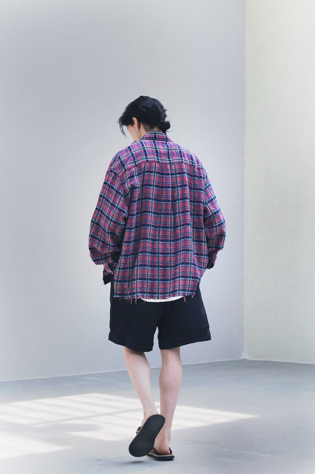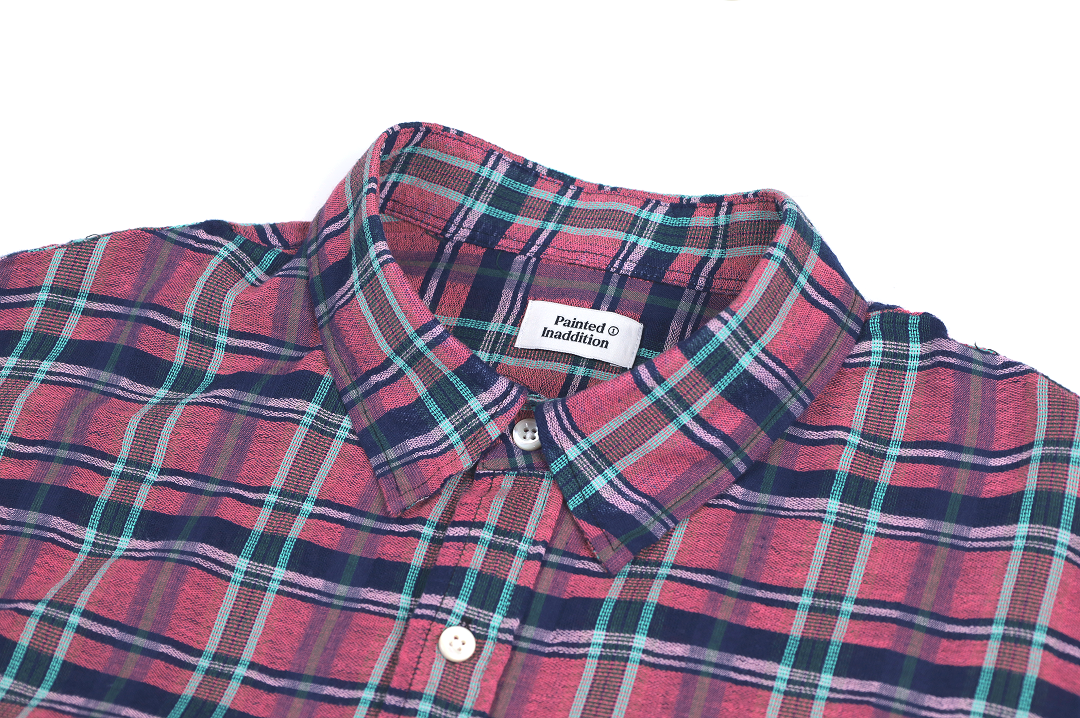 여름에도 걸칠 수 있게 짜임새가 촘촘하지 않아서 통기성이 좋은 면 100% 소재로 제작된 오버핏 체크 셔츠입니다. 핑크와 네이비 체크 패턴의 원단으로 제작 했습니다. 기본처럼 보일 수 있지만 밑단은 데끼처리를 해서 자연스럽게 원단의 올이 빠져보이도록 디자인했습니다. 니혼바리 봉제방식이며 인타방식에 비해 실이 쉽게 풀리지 않고 마감이 깔끔하다는 장점이 있는 고급 봉제 입니다. 편안한 착용감과 스타일리시한 실루엣을 동시에 제공하며, 3mm 트로카스 자개단추를 사용했습니다.