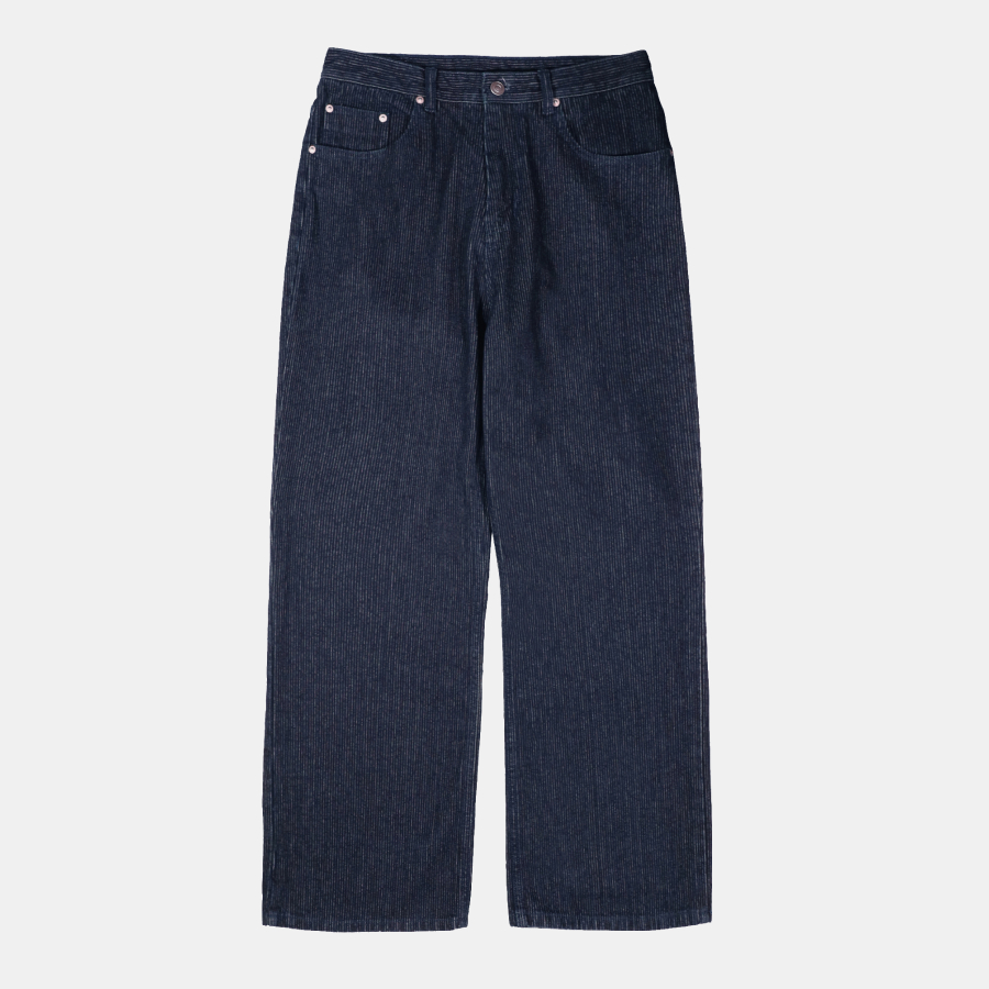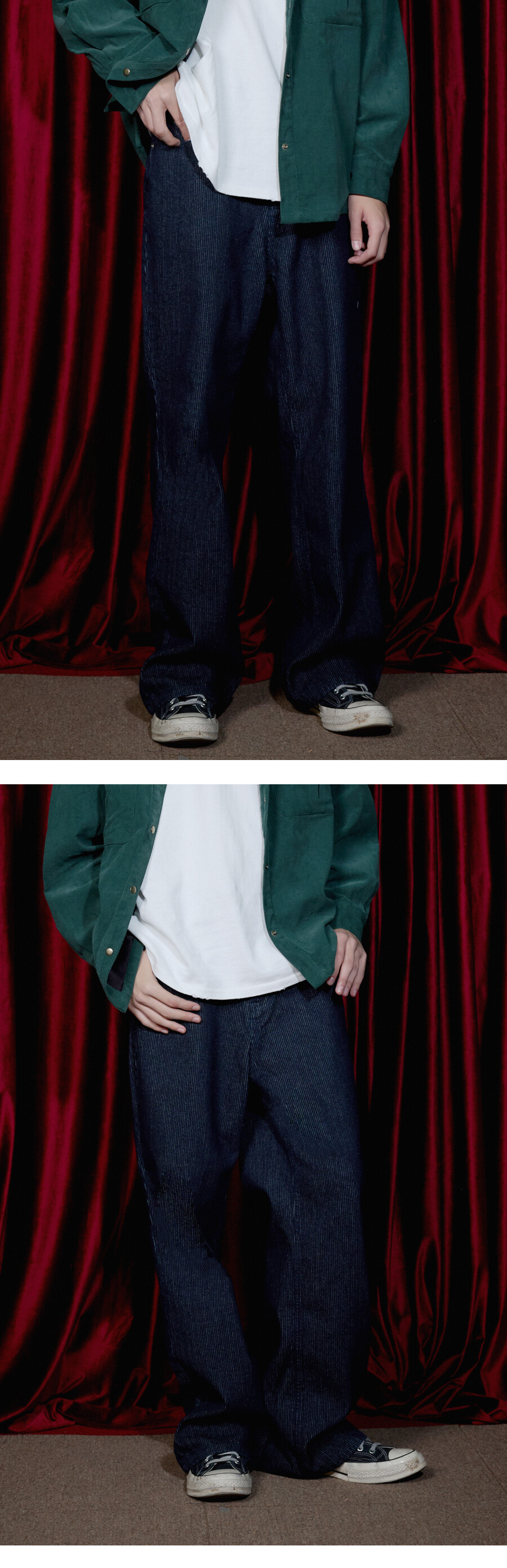면 100%의 와이드 스트레이트핏 데님 팬츠로, 유니크한 골지 조직이 돋보이며 자연스럽게 떨어지는 실루엣이 특징입니다. 노말 워싱으로 생지 느낌의 컬러감을 살렸으며, YKK사 지퍼를 사용했습니다.