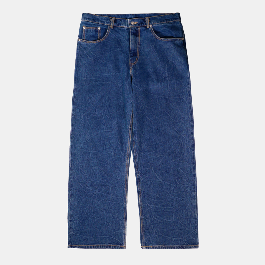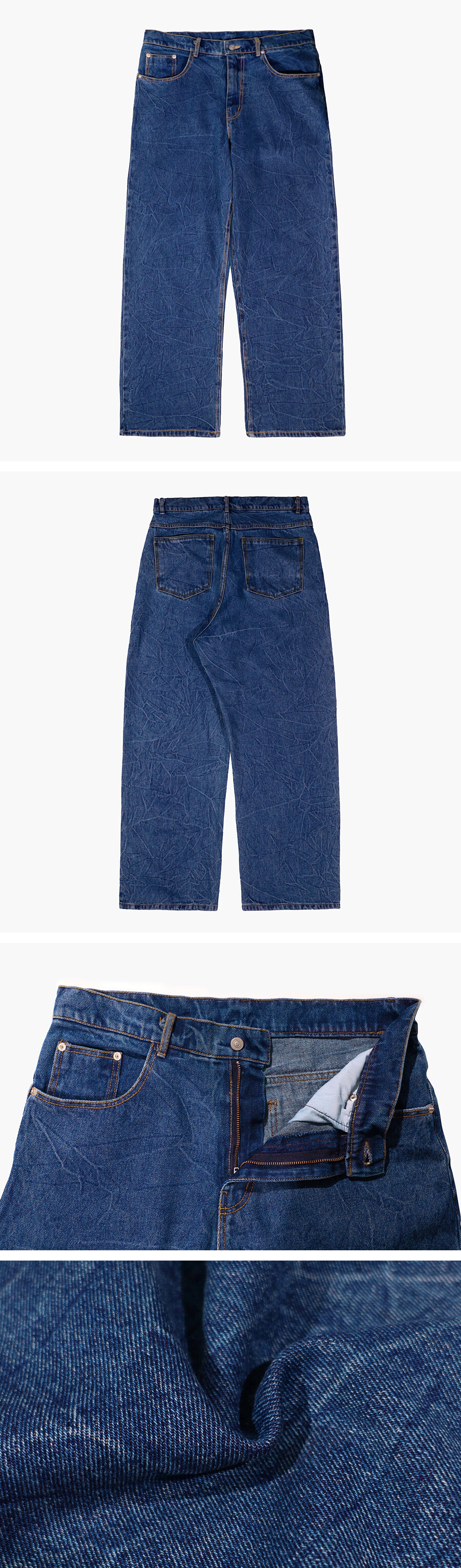 면 100%의 와이드 스트레이트핏 데님 팬츠로, 탄탄한 7수 코튼 원단을 사용하여 견고합니다. 내추럴한 크랙 워싱이 포인트이며, 자연스럽게 떨어지는 실루엣과 YKK사 지퍼 디테일을 갖추었습니다.